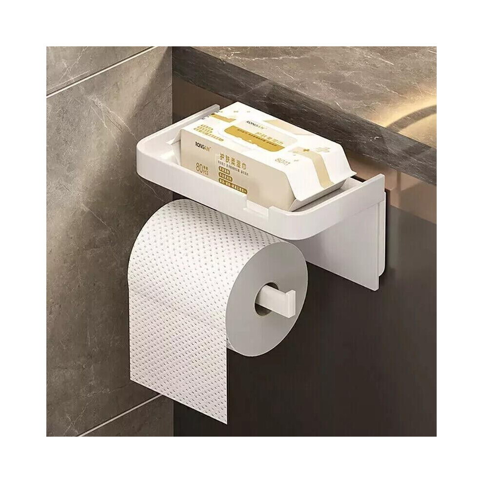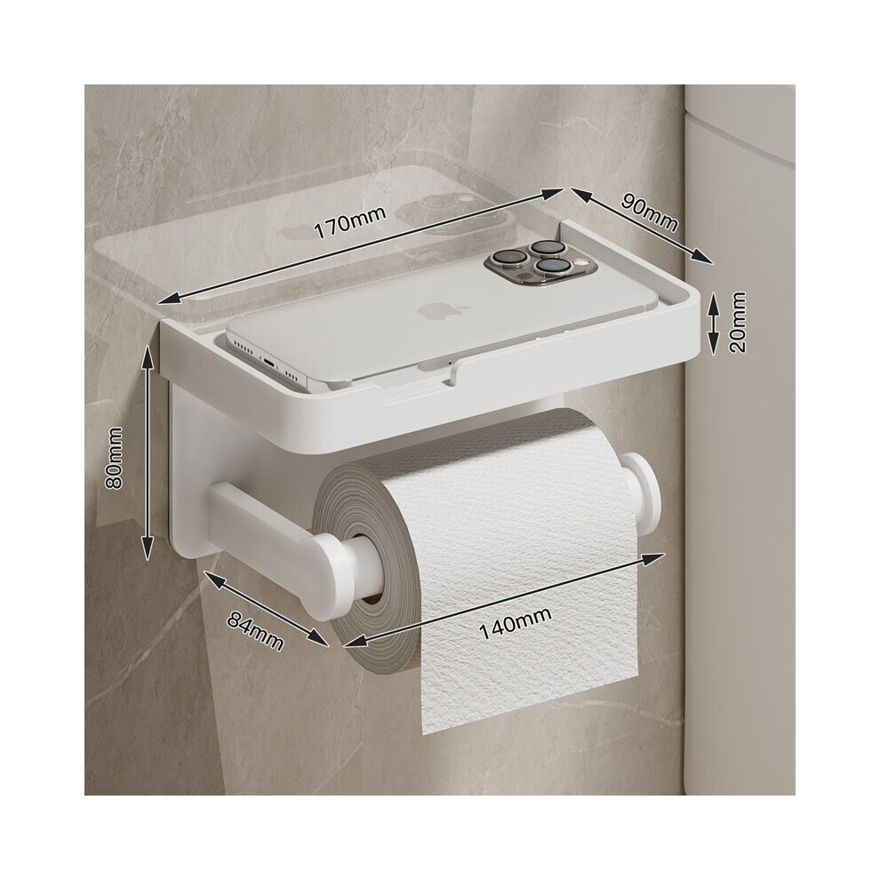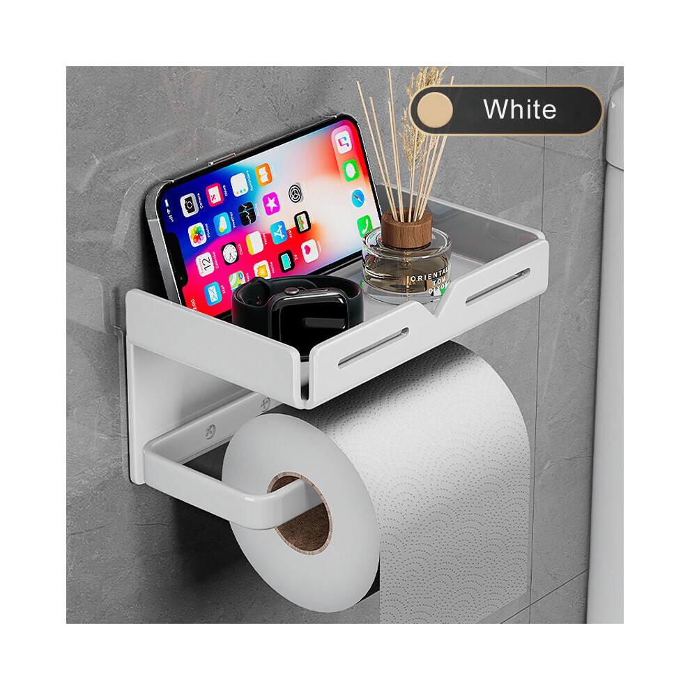 (White) Bathroom Toilet Paper Roll Holder Wall-Mounted With Mobile Phone Storage Shelf ~ bathroom accessories Installation Plastic Smooth White