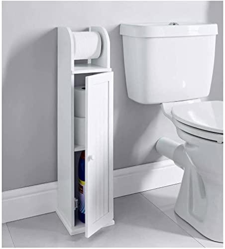 White Waterproof Storage Cabinets Freestanding Toilet Tissue Cabinet with Paper Roll Holder and Door, Space-Saving Laundry Cupboard Organiser Unit, for Living Room, Bedroom, Kitchen, 7.1x7.9x31.5inch
