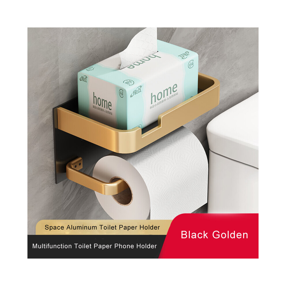 (a-Black Golden) Aluminum Bathroom Double Bar Toilet Paper Holder with Shelf Wall Toilet Phone Holder Black Grey White Toilet Paper Roll Holder