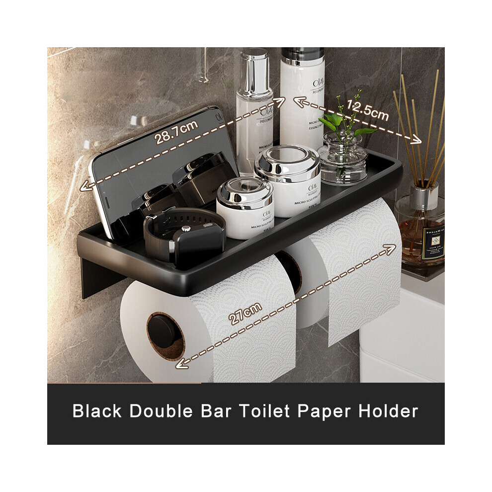 (a-Black A) Aluminum Bathroom Double Bar Toilet Paper Holder with Shelf Wall Toilet Phone Holder Black Grey White Toilet Paper Roll Holder