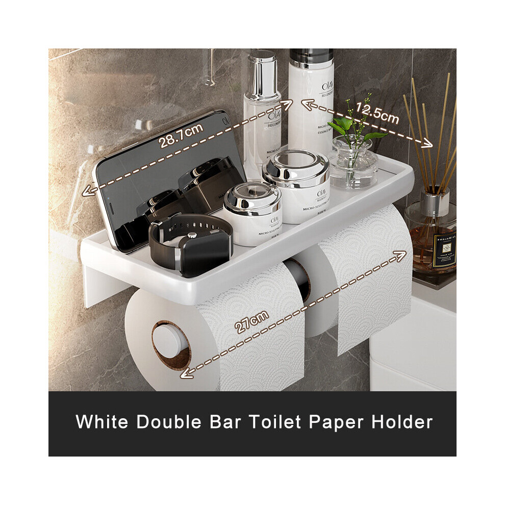 (a-White E) Aluminum Bathroom Double Bar Toilet Paper Holder with Shelf Wall Toilet Phone Holder Black Grey White Toilet Paper Roll Holder
