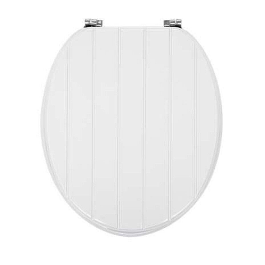 White Toilet Seat MDF Wood Tongue And Groove Plain Stripe Design Chrome Hinges