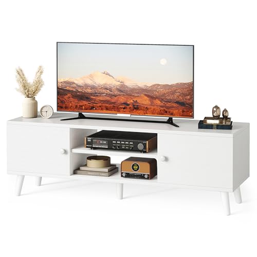 Hiborth TV Stand for 55-65 Inch TVs, Mid-Century Modern TV Console with Storage, White Entertainment Center for Living Room and Bedroom, Wooden TV Cabinet with Double Doors and Adjustable Shelves
