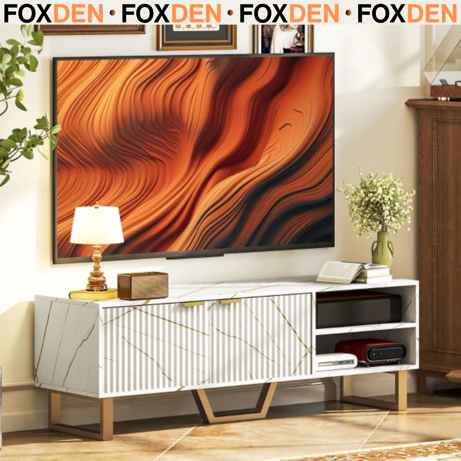 MMT TV Stand Cabinet with Fluted Ribbed Gloss Doors and Gold Legs, 130cm TV Unit for Up to 65-Inch TVs, Available in White or Black (White)