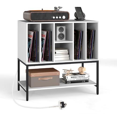 COSTWAY Record Player Stand with Charging Station, Turntable Stand End Side Table with 5 Shelves for 150 Albums, Metal Legs Vinyl Record Storage Cabinet Holder for Living Room Bedroom (White)