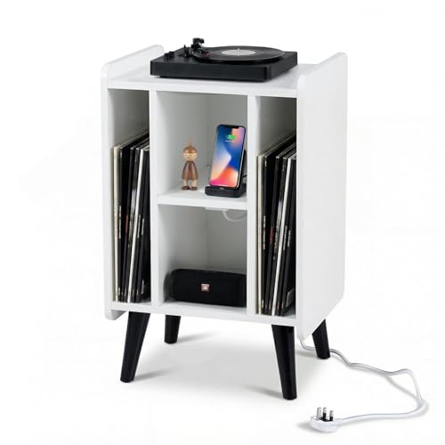 CASART Record Player Stand, Turntable Stand with Charging Station, Metal Legs & Cable Hole, Vinyl Record Storage Cabinet Holds up to 150 Albums End Table for Living Room Bedroom (White)