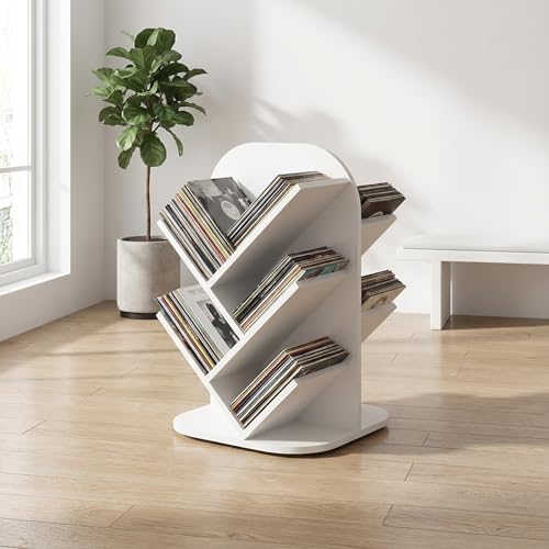 DKPLOE Wooden Record Player Stand Holds Up to 250+ Vinyls 360° Rotatable Mid-Century Vinyl Record Storage Suitable for Bedrooms Living Rooms Cafes and Study Rooms(White)