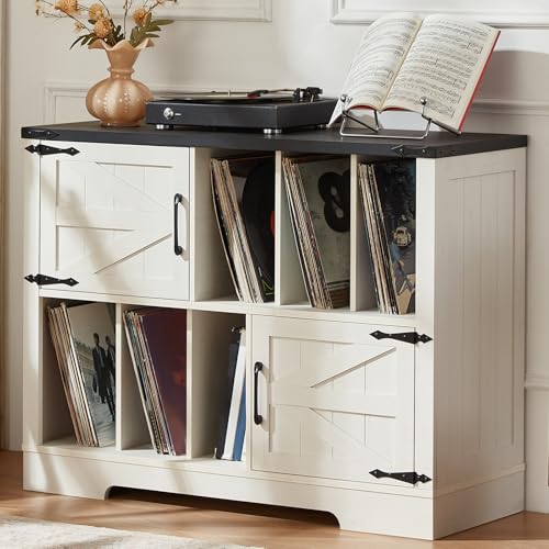 LELELINKY Large Record Player Stand with Storage, 1m Vinyl Records Storage Organizer Cabinet, Farmhouse Wood Vinyl Table with Barn Doors, Mid-Century Turntable Stands for Living Room, White