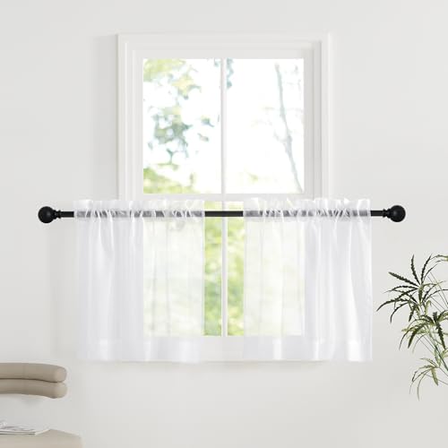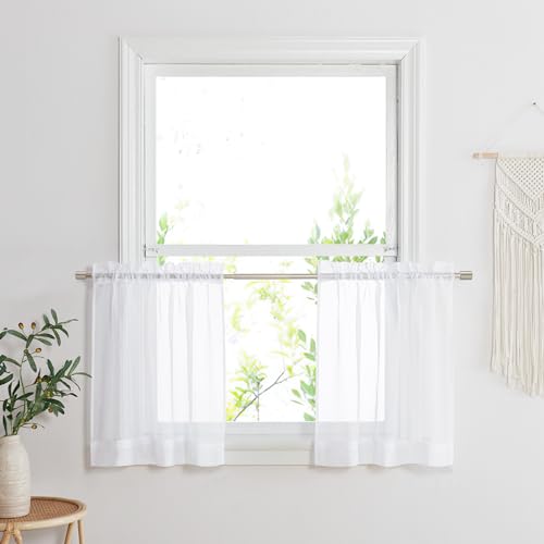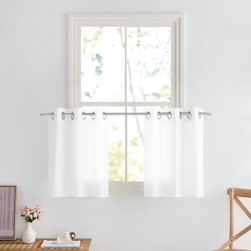 PONY DANCE White Voile Curtains 24 Drop Pair, Non-See-Through Cat Proof Window Net Curtains for Kitchen/Cafe Privacy Protect Eyelet Sheer Panels for Small Windows, 29 Inch Wide Per Panel, Set of 2