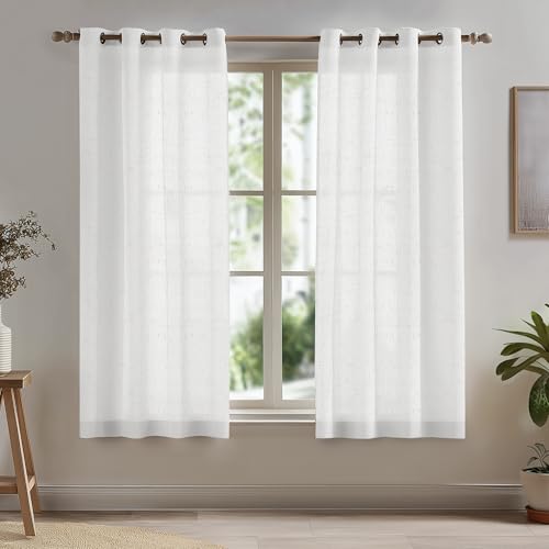 Deconovo Woven White Voile Curtains Eyelet, Decorative Linen Look Net Curtains, Semi Transparent Window Sheer Curtains for Bedroom, 55 x 45 Inch, White Linen Sheer, 2 Panels