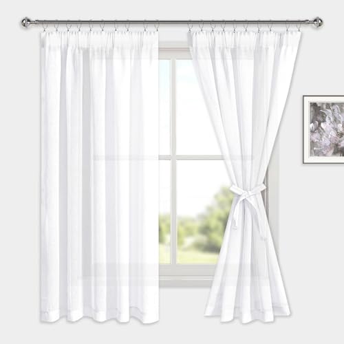 DWCN White Voile Curtains with Tiebacks Net Curtain for Window Semi Transparent Pencil Pleat Curtains for Living Room, 2 Panels, W46 x L72 Inch