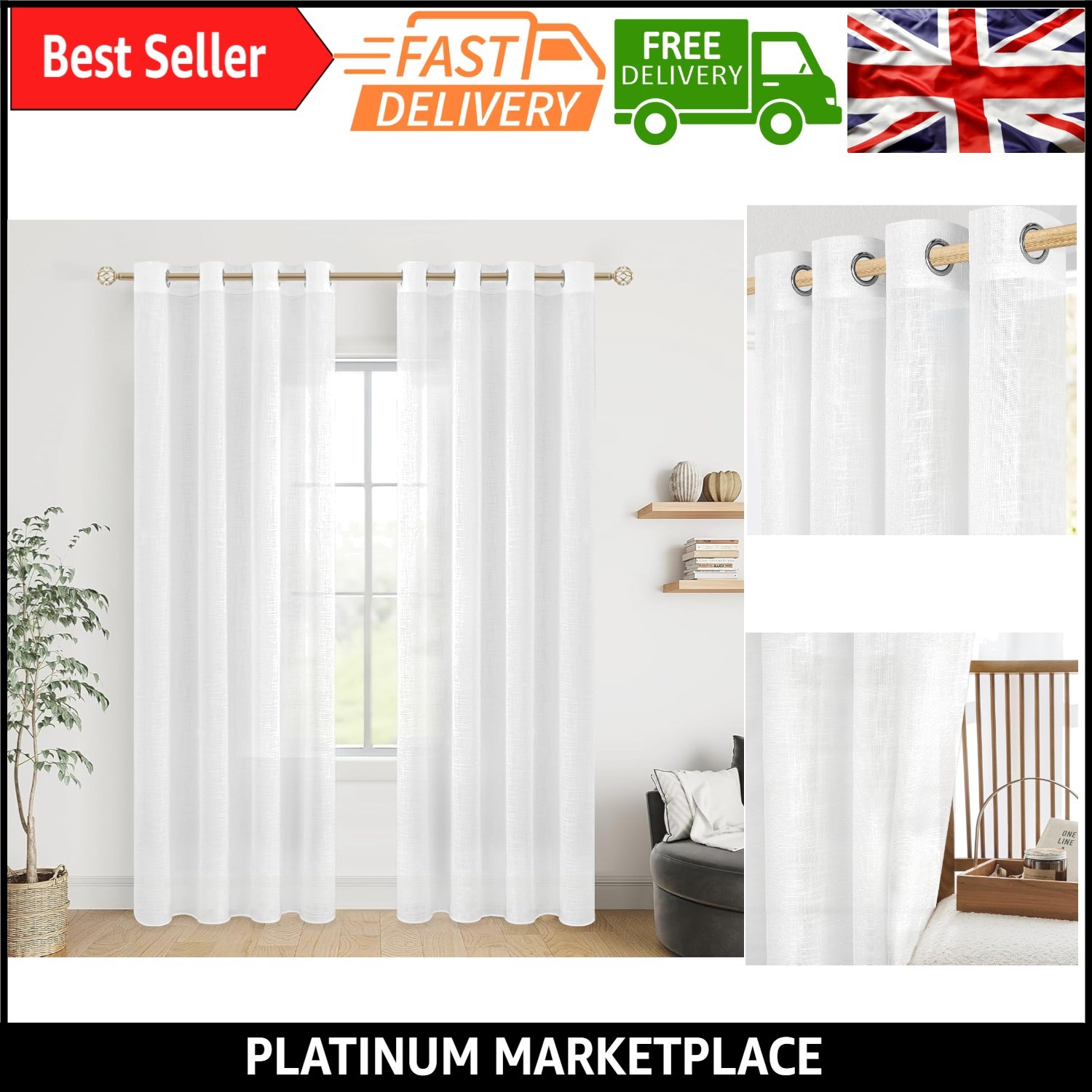 PONY DANCE White Voile Net Curtains - 95 Drop, Natural Faux Linen Front Door...