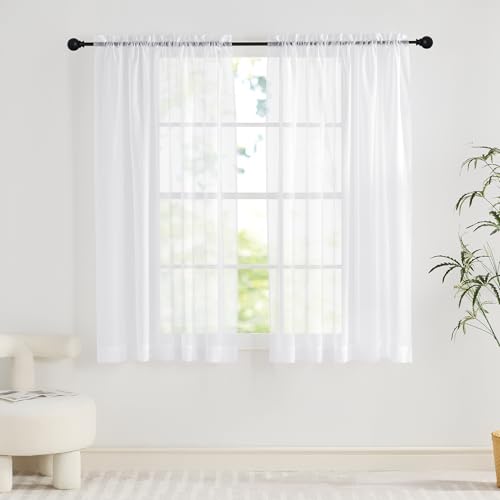 Pacok White Voile Curtains, 45 Drop 2 Panels Net Curtain for Windows, Rod Pocket Sheer Curtain Panel Voile Curtains for Living Room Kitcken Bedroom W56xL45 Inch(White, 142 x 114cm)