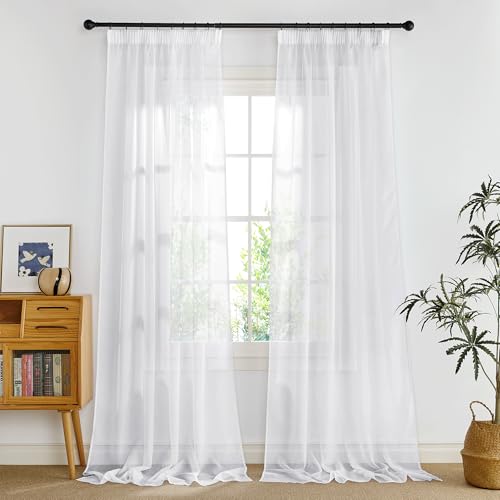 PONY DANCE Extra Long White Voile Curtains - Bedroom Door Curtain Pencil Pleat Window Voile Panels Home Decoration Faux Linen Curtains for Living Room, 2 Panels, W 55 x L 102 inch, 140CM x 260CM