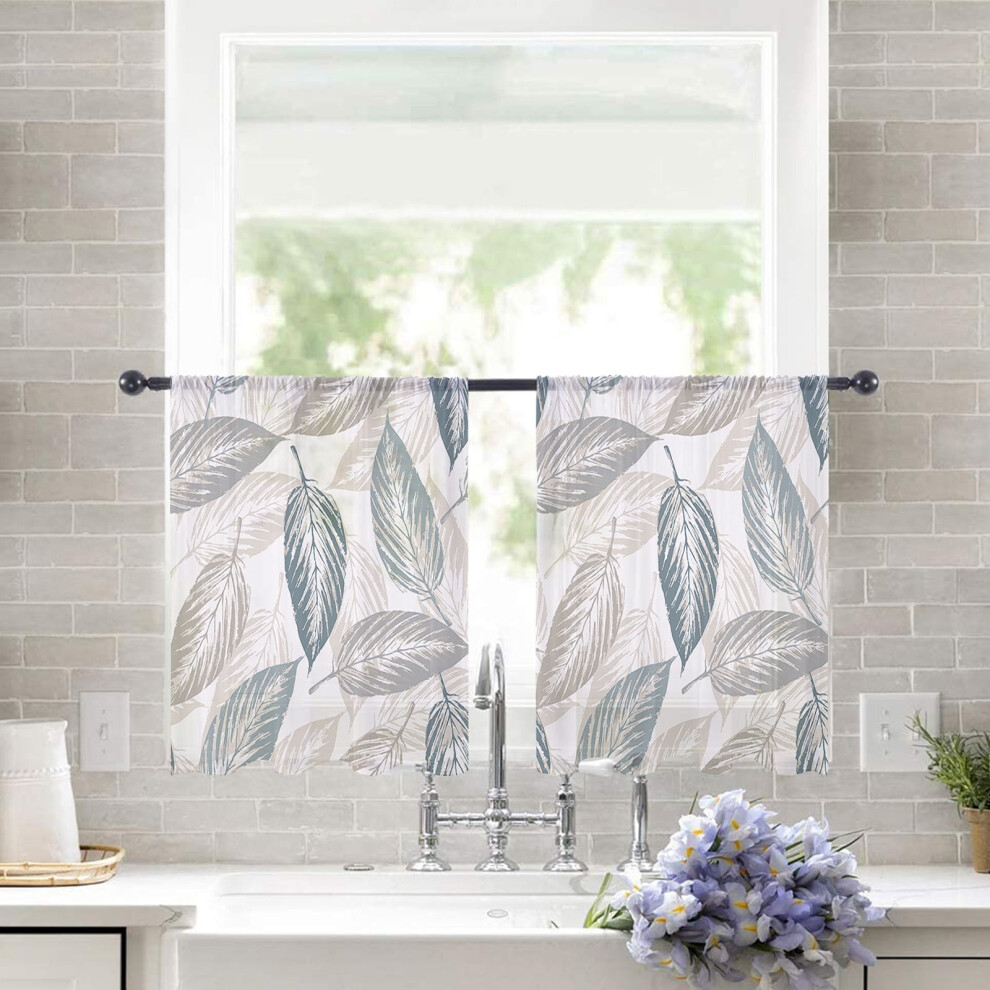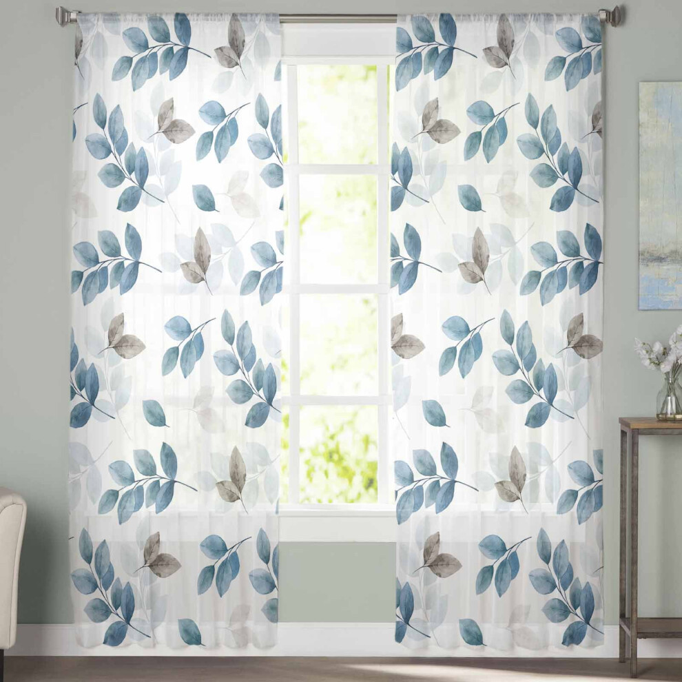 Sheer Curtains 52"x45", Abstract Blue/Gray Leaves on White, Light Filtering Voile Drapes with Rod Pocket â 2 Panels