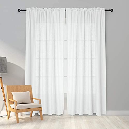 Melodieux White Linen Textured Semi Sheer Curtains 84 Inches Long for Living Room Bedroom Natural Flax Linen Rod Pocket Voile Drapes, 52 by 84 Inch (2 Panels)