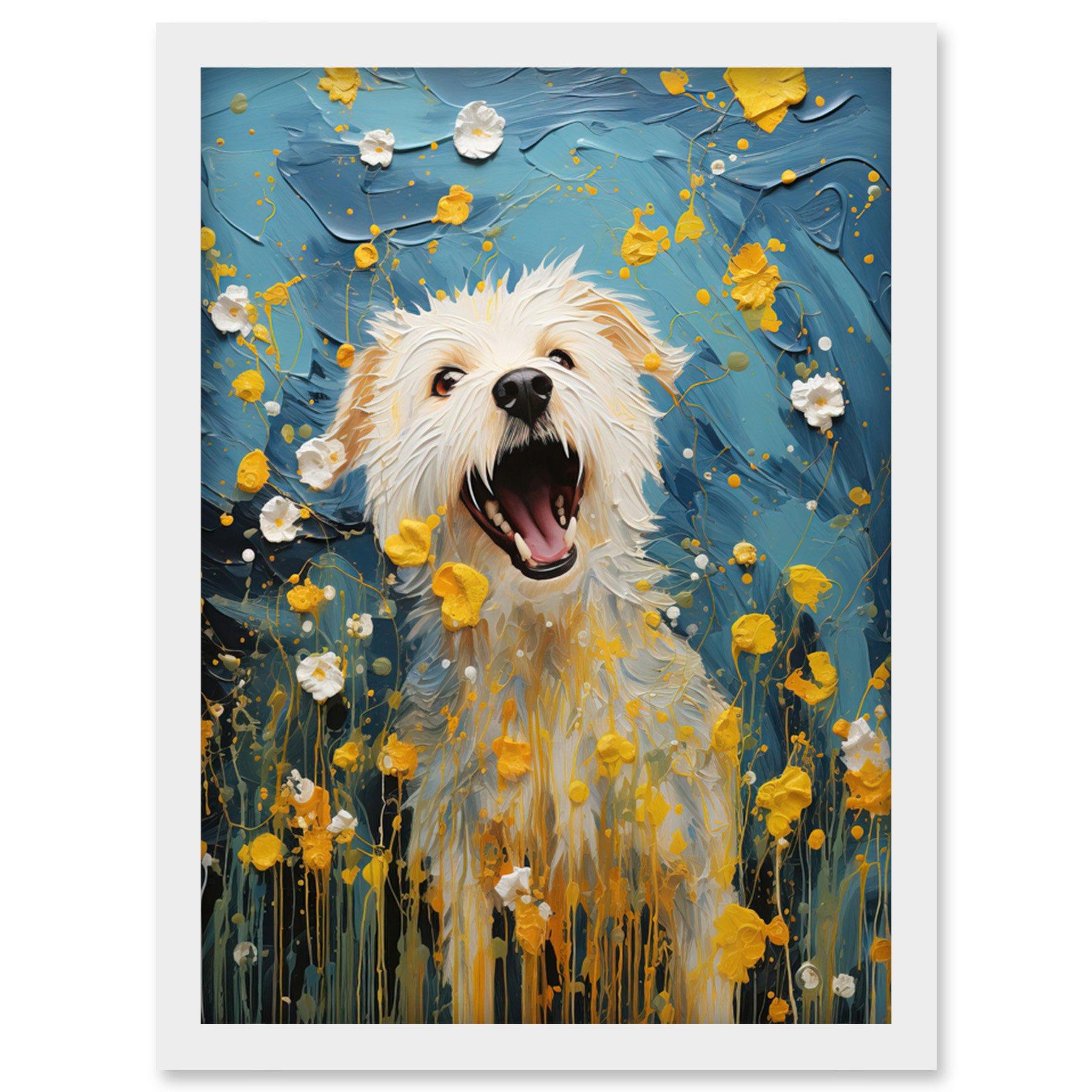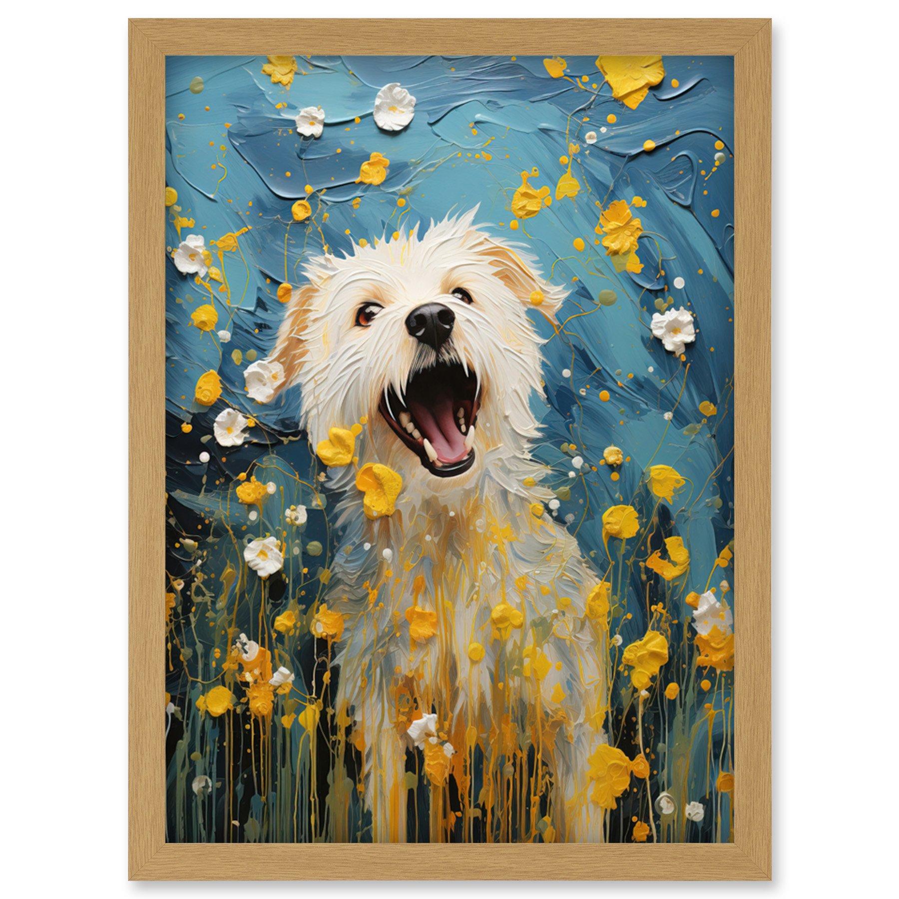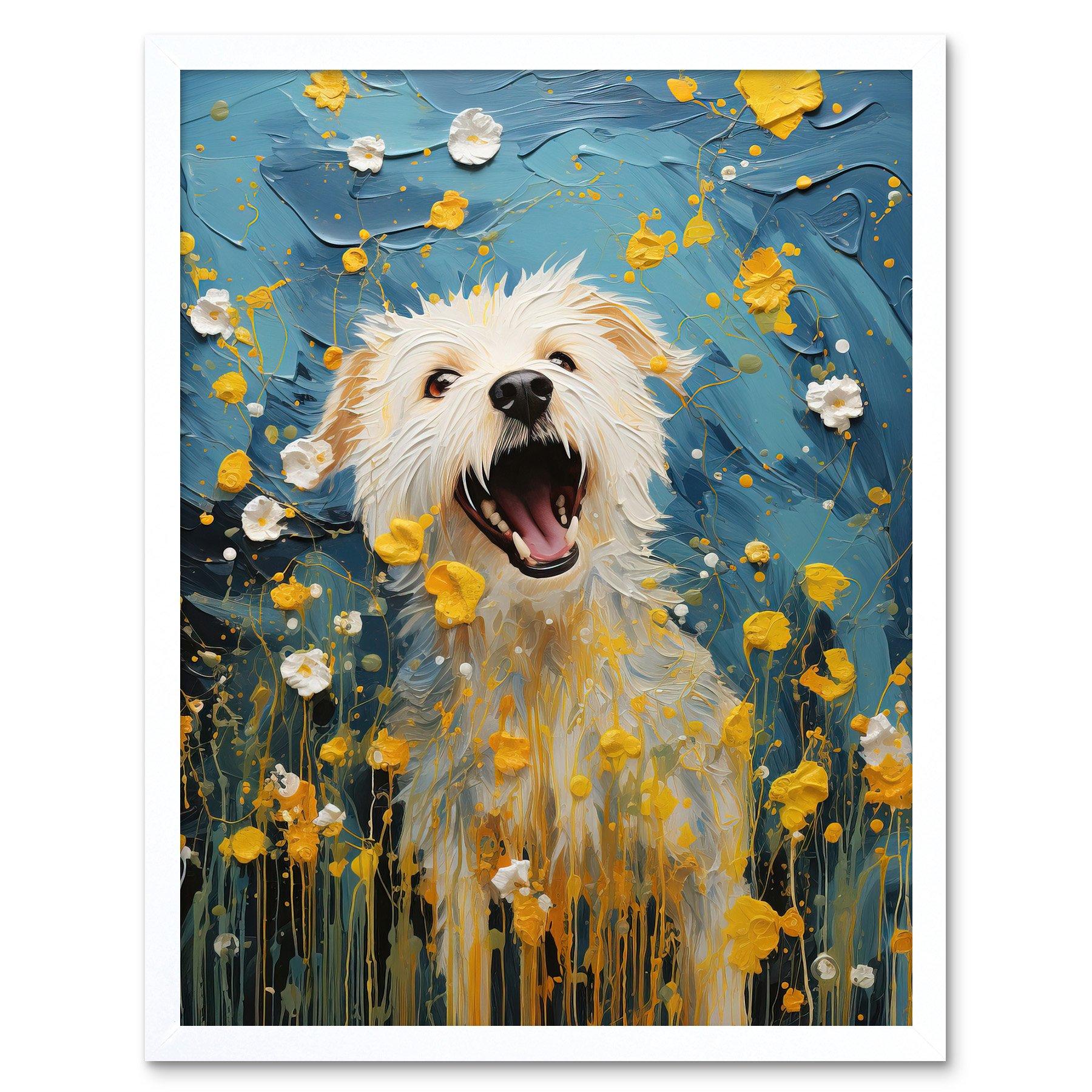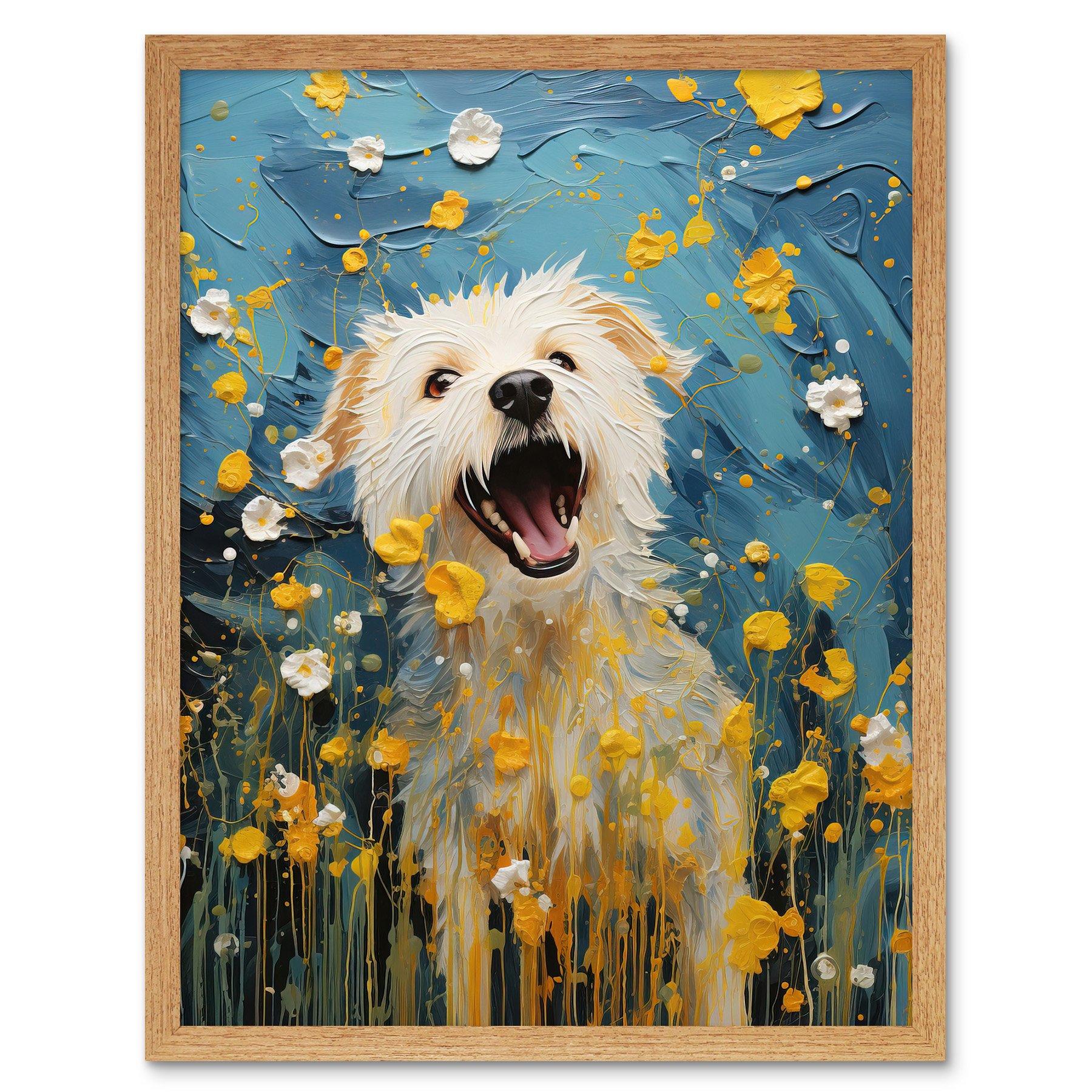Chasing the Flowers White Terrier in Spring Meadow Thick Paint Oil Painting Blooms Coton de Tulear Artwork Framed Wall Art Print A4