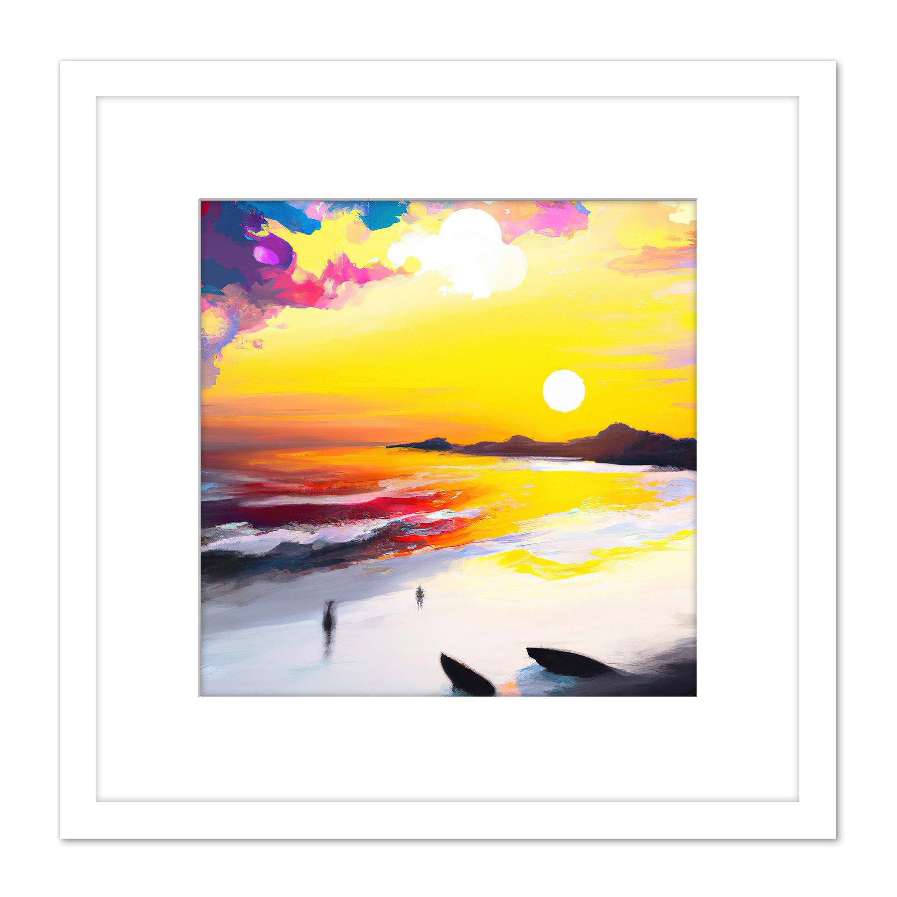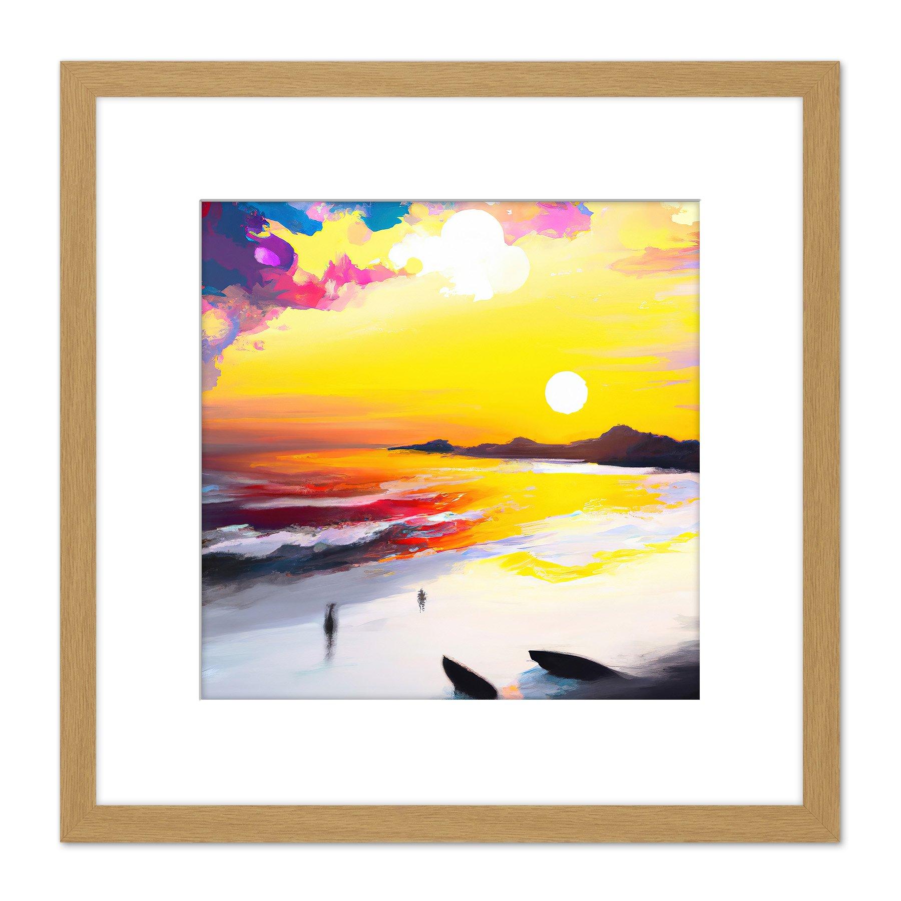 Coastal Sunset Figures Walking on White Sand Modern Abstract Bright Colourful Oil Paint Square Wooden Framed Wall Art Print Picture 8X8 Inch