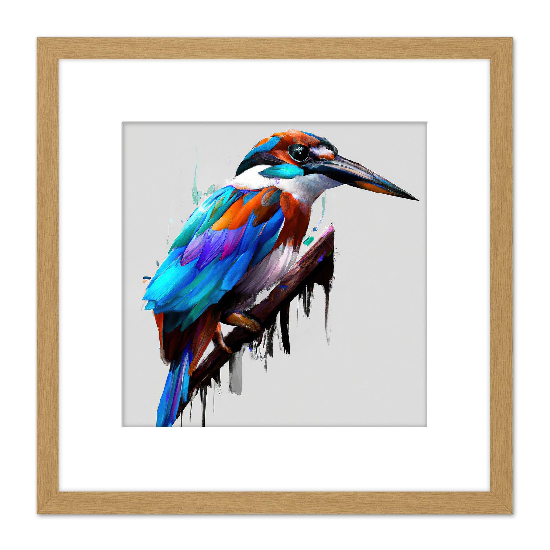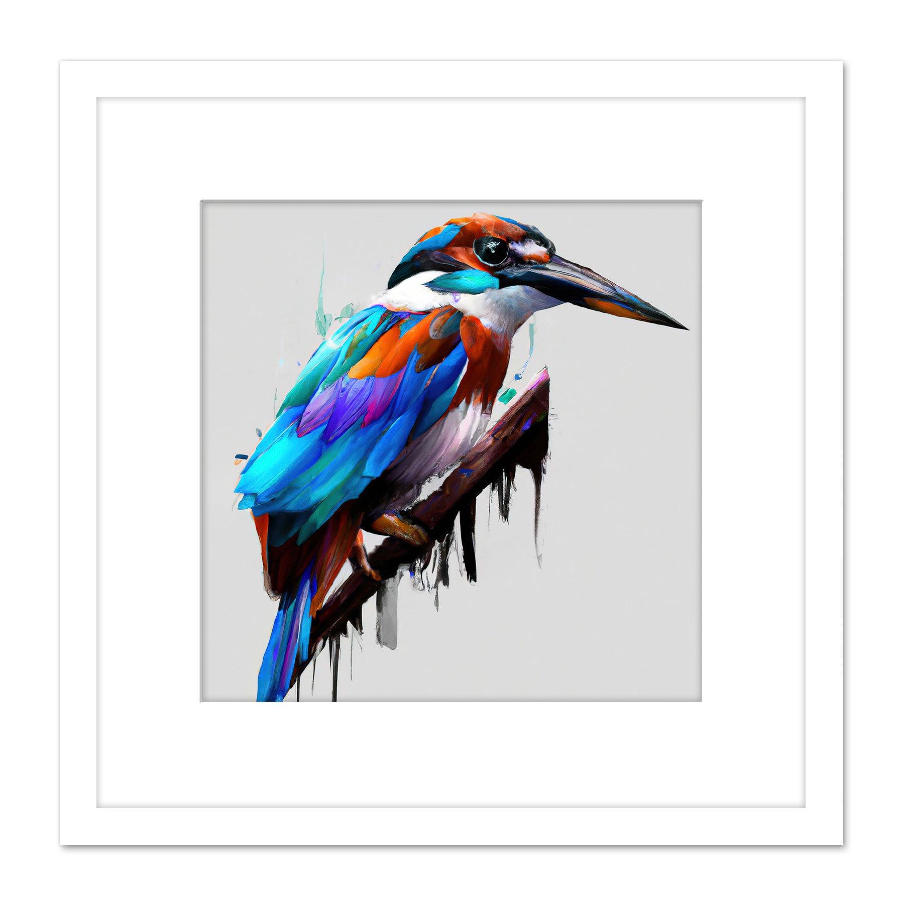 Kingfisher Bird and Branch Portrait Blue Purple Orange Acrylic Paint on White Square Wooden Framed Wall Art Print Picture 8X8 Inch