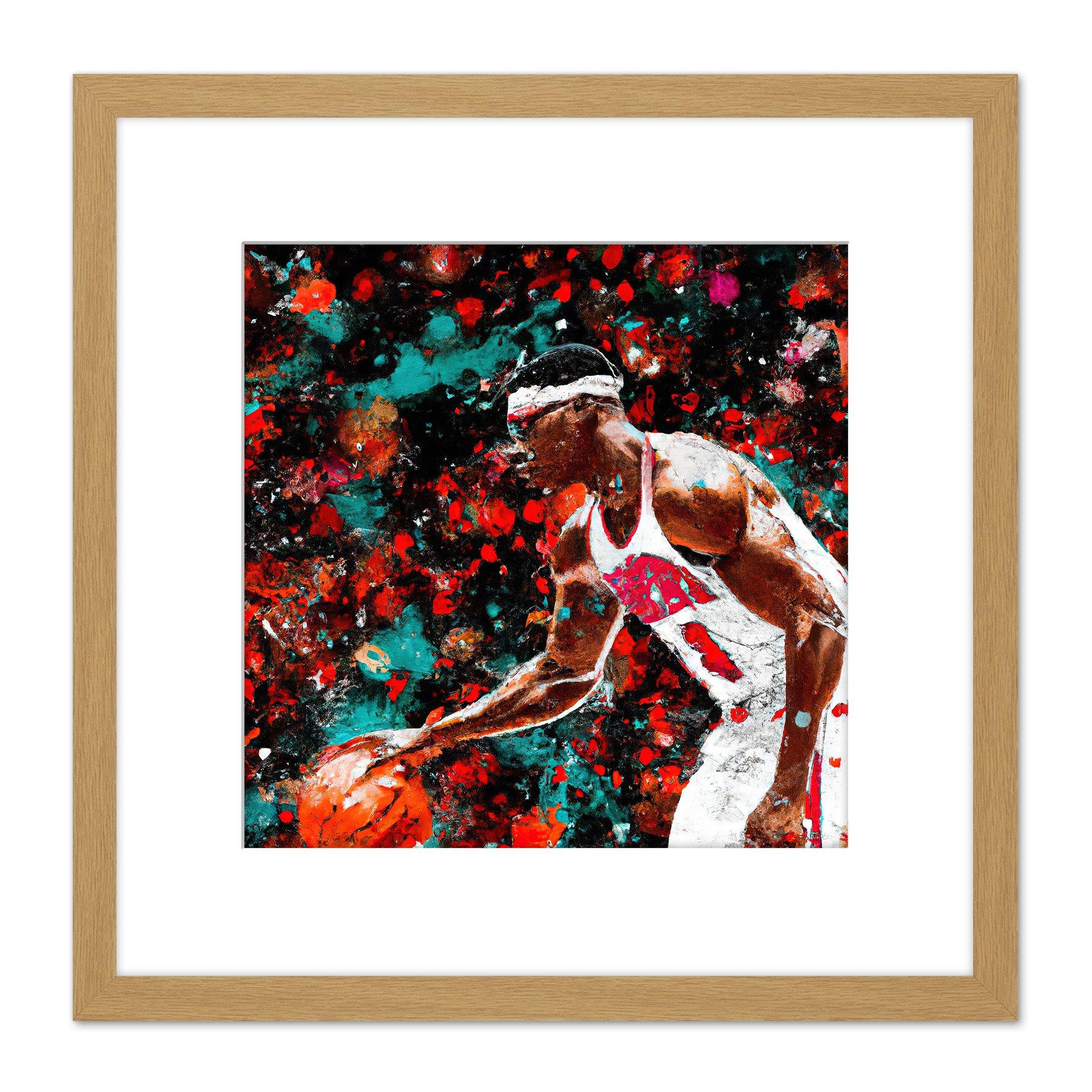 Basketball Player Ball Dribble Modern White Red Teal Paint Splat Painting Square Wooden Framed Wall Art Print Picture 8X8 Inch