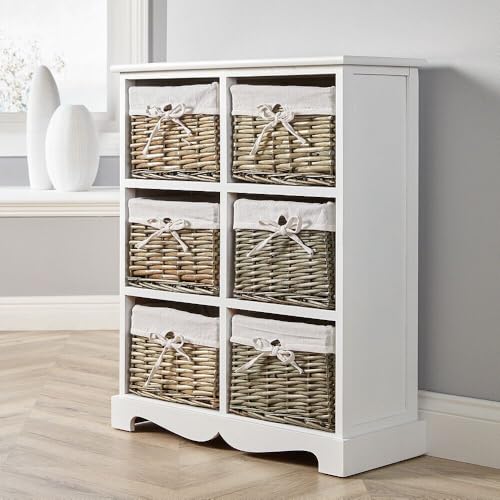 Home Source Bedroom Wooden Storage Unit, Woven Willow Wicker Baskets, 6 Drawer Wide Cabinet Chest, White