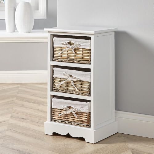 Home Source Bedroom Wooden Storage Unit, Woven Willow Wicker Baskets, 3 Drawer Cabinet Chest, White