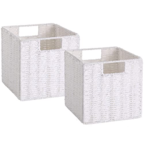 Vagusicc Wicker Storage Basket, Set of 2 Woven Storage Baskets, Foldable Cube Storage Bins, 11 Inch Square Wicker Storage Baskets for Shelves Organizing, White