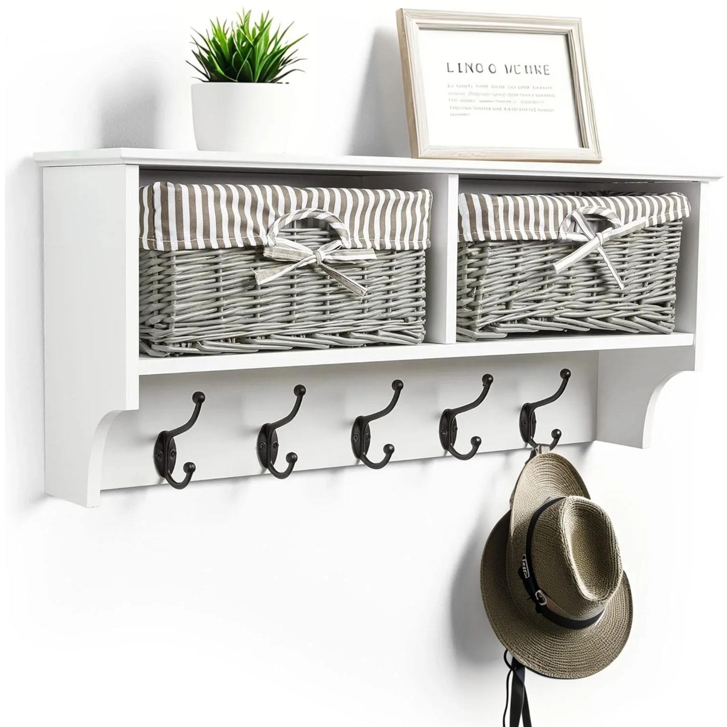 Wall Mounted Coat Rack White Shelf with 2 Grey Wicker Baskets & 5 Double Hooks