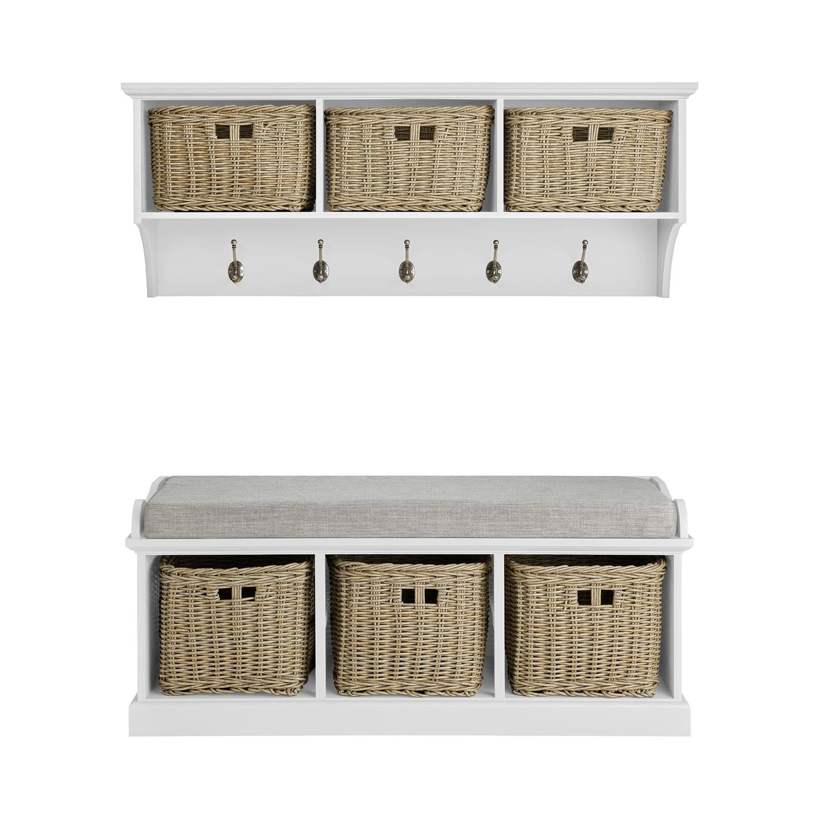 Tetbury White Bench and Coat Rack Set with 3 Faux Wicker Baskets Grey Cushion