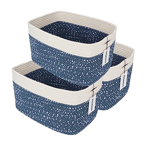XUANGUO White and Blue Cotton Rope storage Basket Bins Woven Basket for Organizing Shelves 14.5X9.5X9.3“ Rectangle Decorative Baskets For storage Books Towels Wicker Nursery basket organizer Set of 3