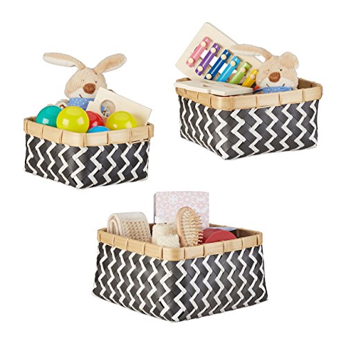 Relaxdays Storage Baskets Set of 3, All Purpose, Bamboo, Waterproof, Stackable, Natural, Wicker Look, Square, Black-White