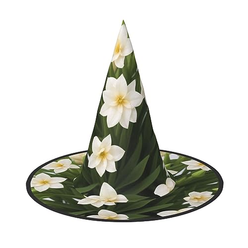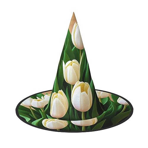 White Tulip Flower Print Halloween Cone Witch Hat Cosplay for Wizards Masquerade Halloween Party Accessories.