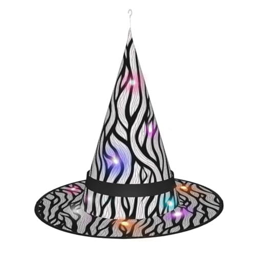 Black White Texture Print Pattern Print Halloween Cone Witch Hat with Led Light Cosplay for Wizards Hat Masquerade Halloween Party Accessories.
