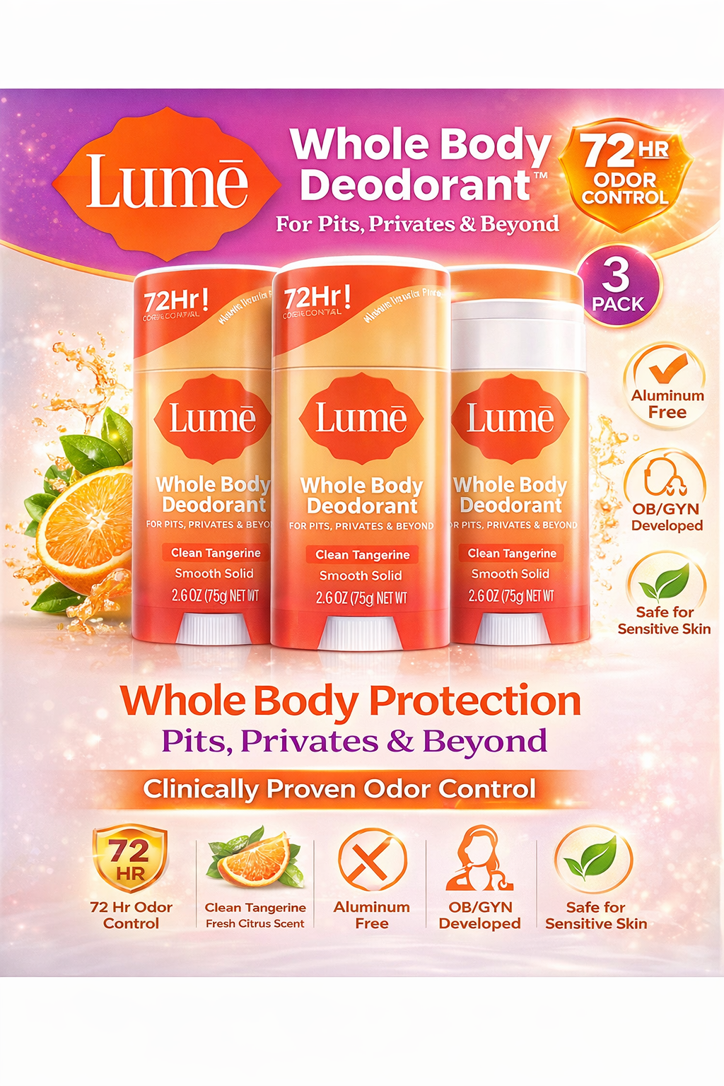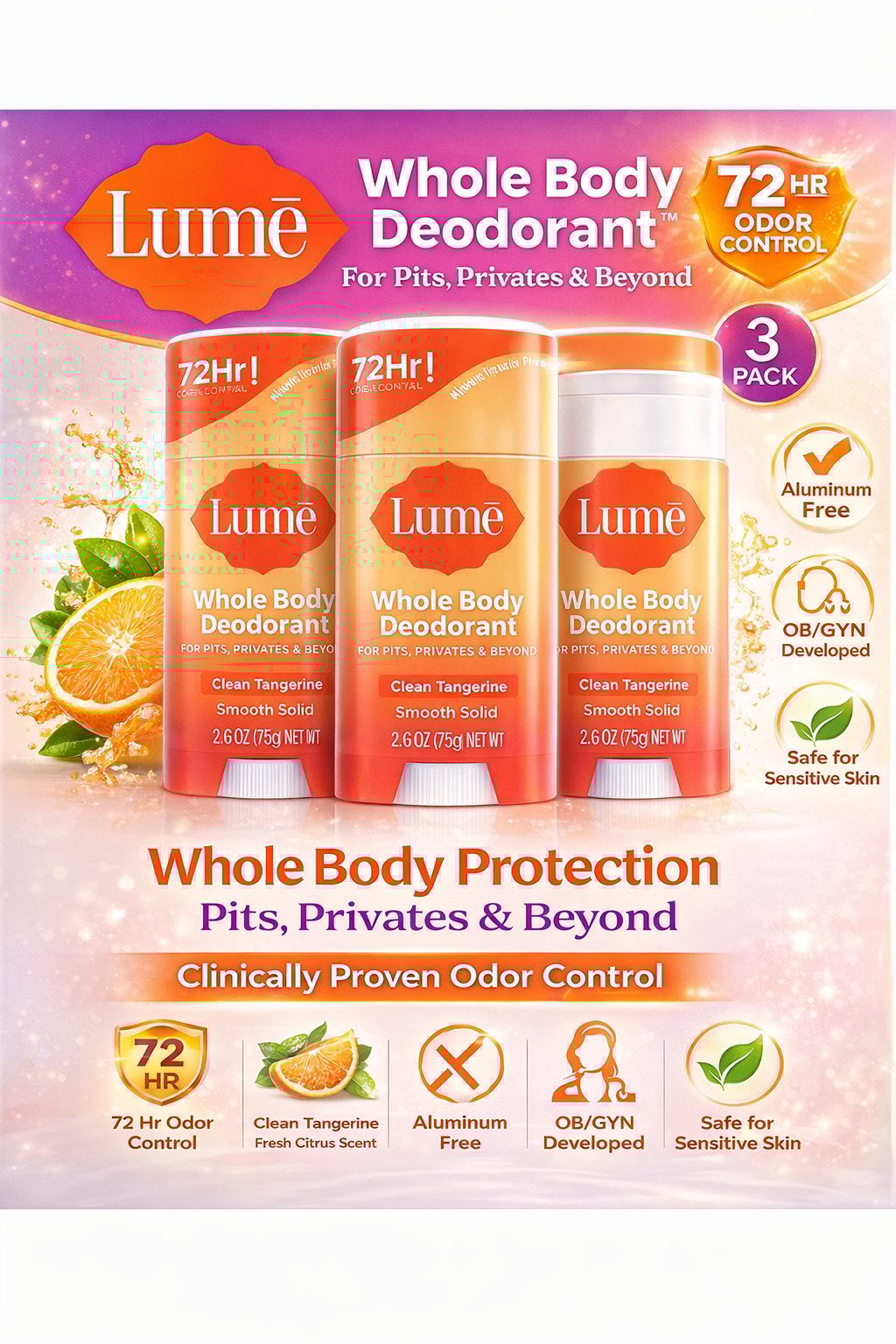 Lume Whole Body Deodorant Smooth Solid Clean Tangerine Aluminum Free sett of 3