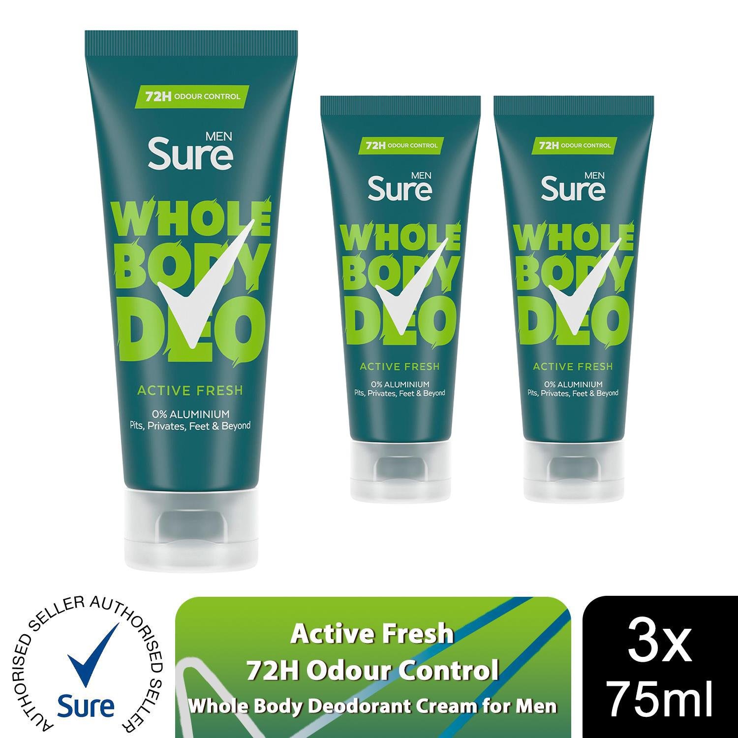 Sure Men Whole Body Deodorant Cream Active Fresh w/ 72H Odour Control 75ml, 3 Pk