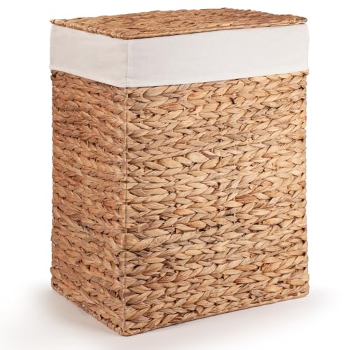 Woodluv Laundry Basket With lid Medium, Water Hyacinth Laundry Hamper, Wicker Bin Storage Organiser, Washing Basket for Dirty Clothes Bathroom, Natural, 38 x 28 x 48 (H) cm