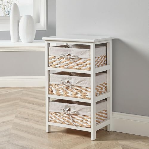 Home Source Storage Chest, Wooden Bedroom Hallway Cabinet, 3 Wicker Basket Drawers, White