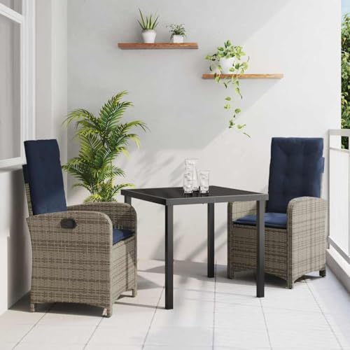 YuuSsea Garden Dining Set with Cushion, 3-Piece, Grey Poly Rattan, Weatherproof Outdoor Dining Set, Balcony Furniture for 2 People, Durable Wicker Outdoor Furniture, Elegant Glass Top