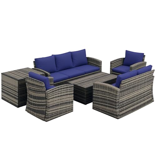 Outsunny 6 Pieces Rattan Garden Furniture Set, 7 Seater Wicker Outdoor Furniture Set with Storage Tea Table & Side Table, Sectional Garden Sofa Set with Cushions, Navy Blue