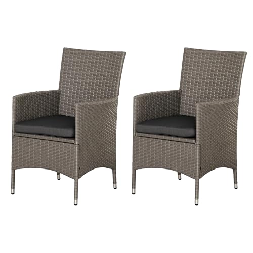 Outsunny 2 Pieces Outdoor PE Rattan Dining Chairs Set with Cushion, Garden Armchair with Armrests, High Backrest, Metal Frame Patio Wicker Furniture, Grey