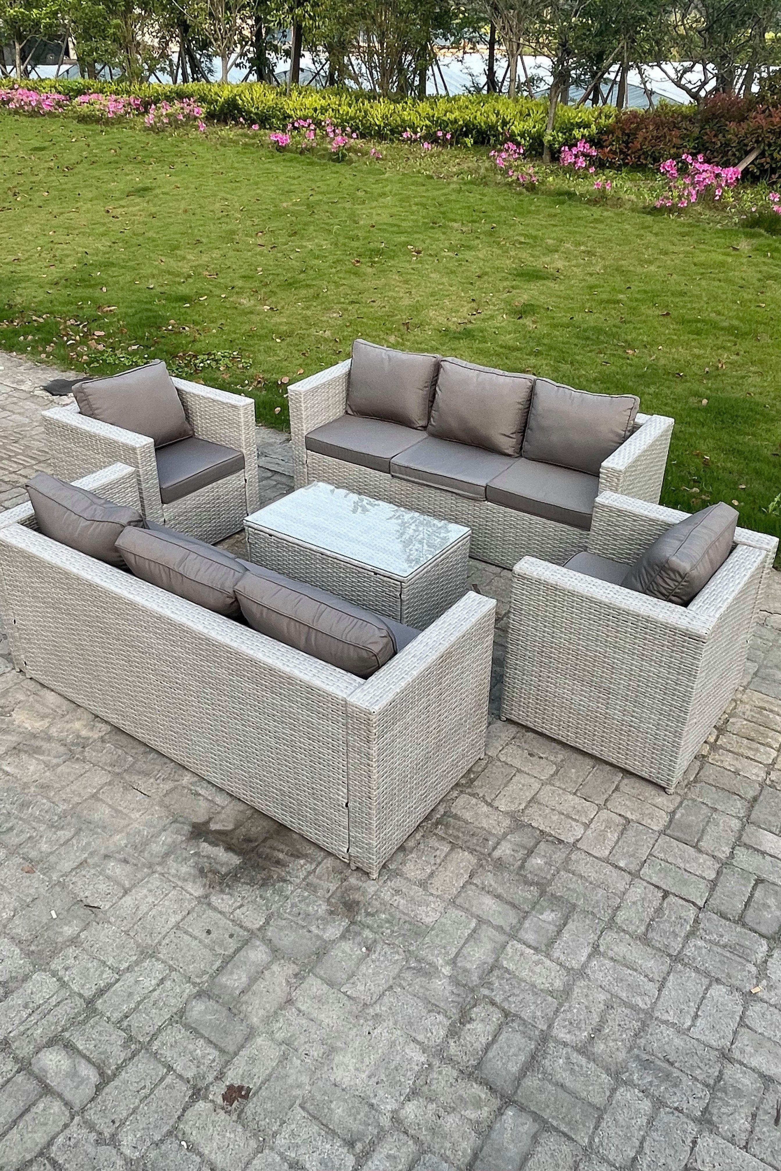 Light Grey Outdoor PE Rattan Garden Furniture Set Wicker Sofa Set Oblong Coffee Table Armchair