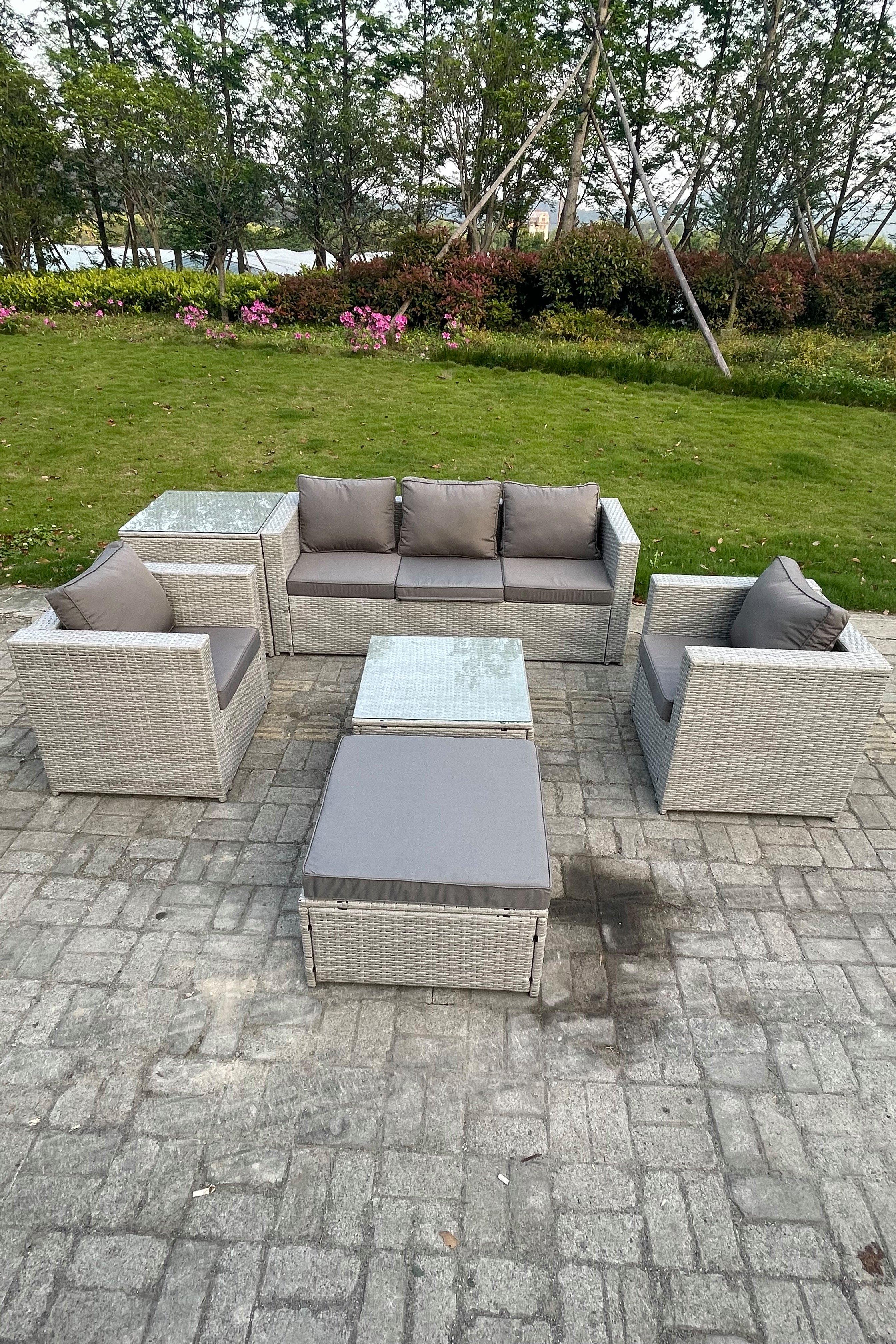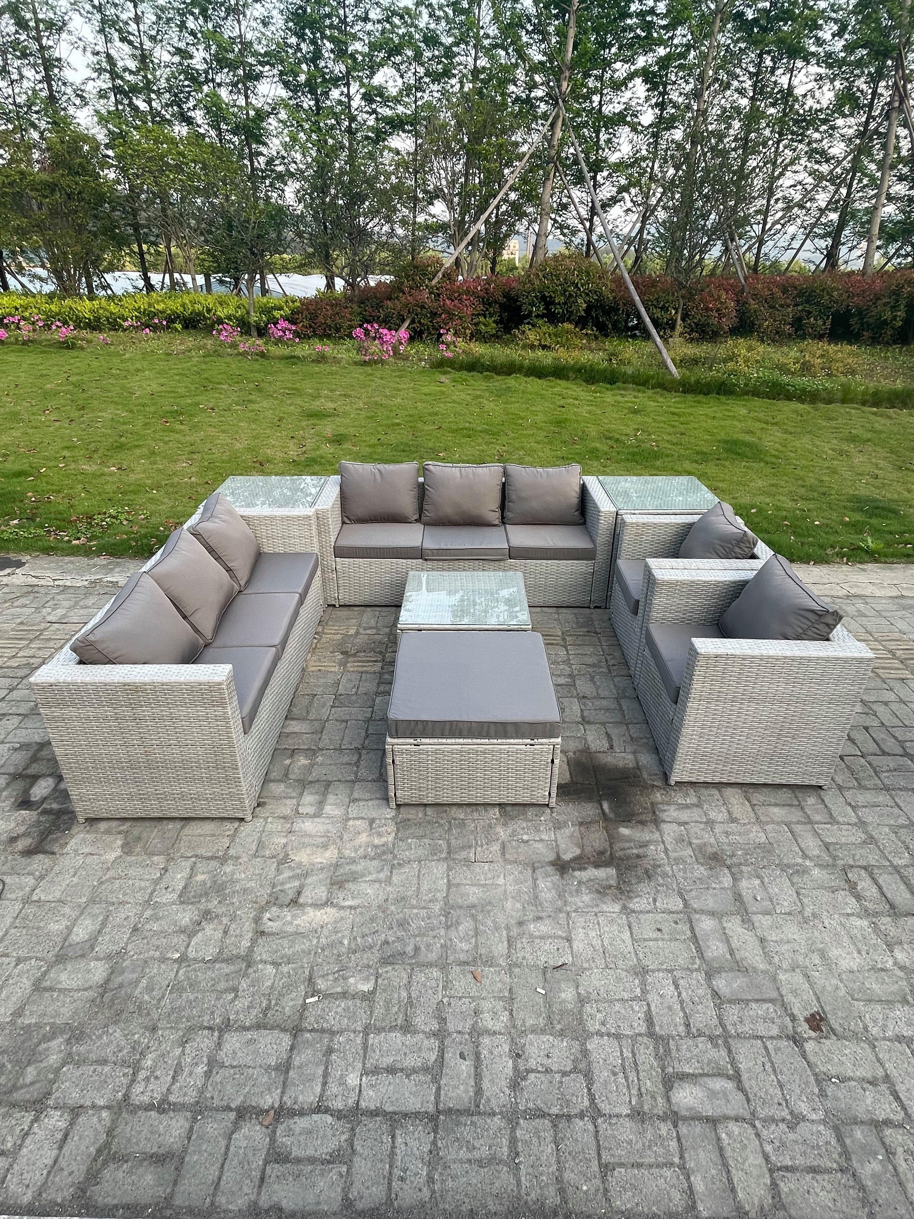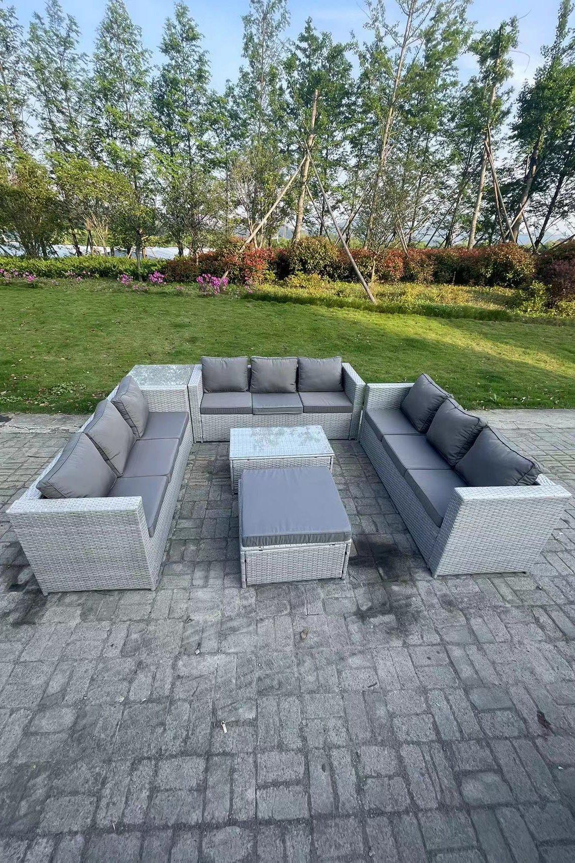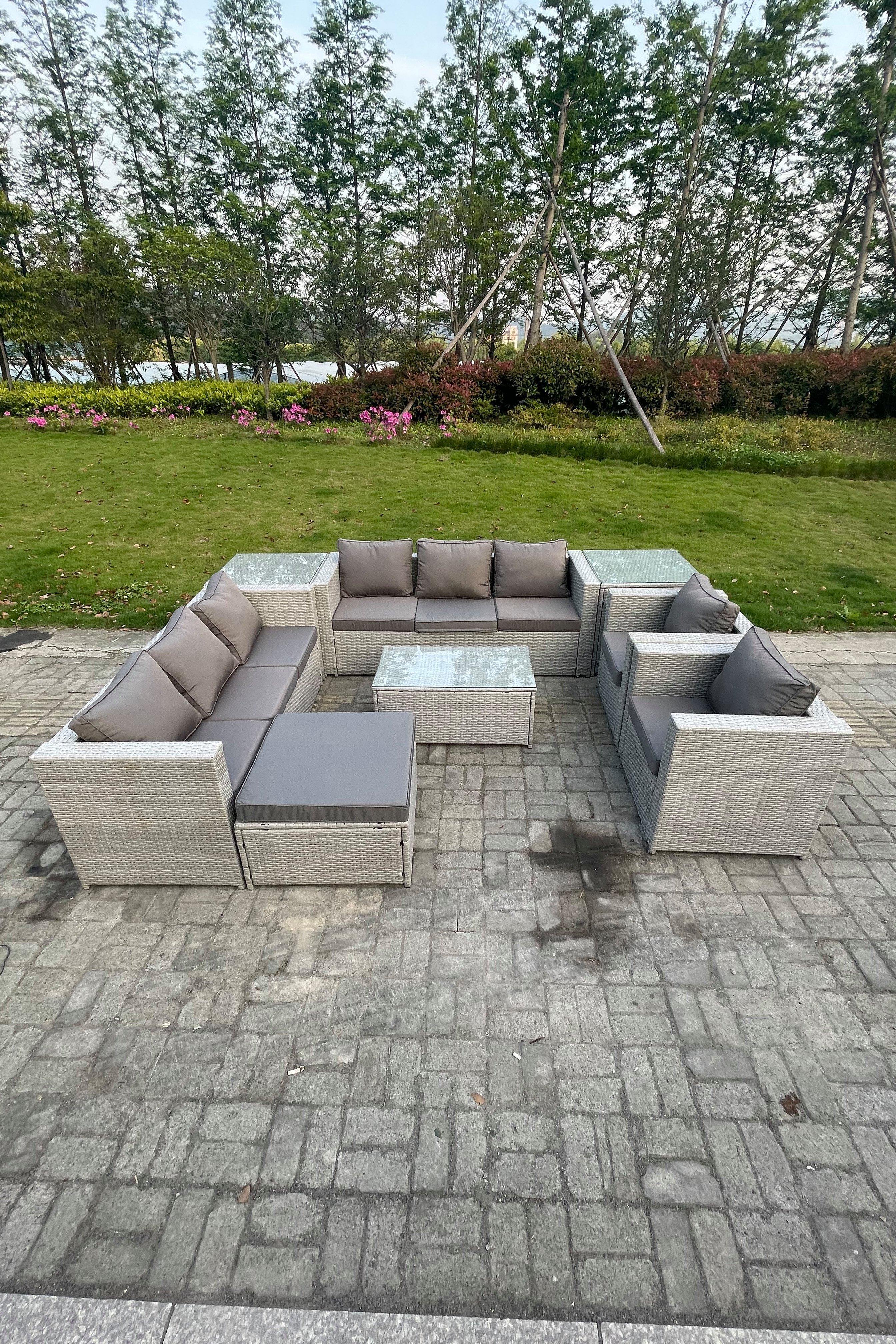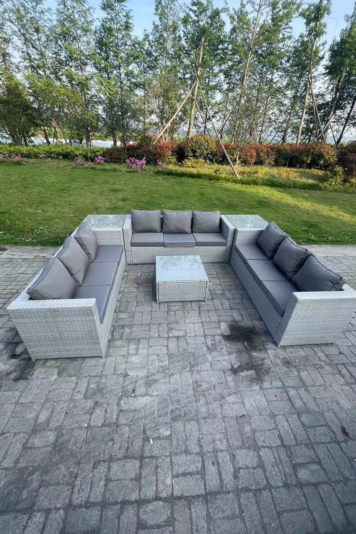Light Grey Outdoor PE Rattan Garden Furniture Set Wicker Sofa Set 2 Side Table 9 Seat