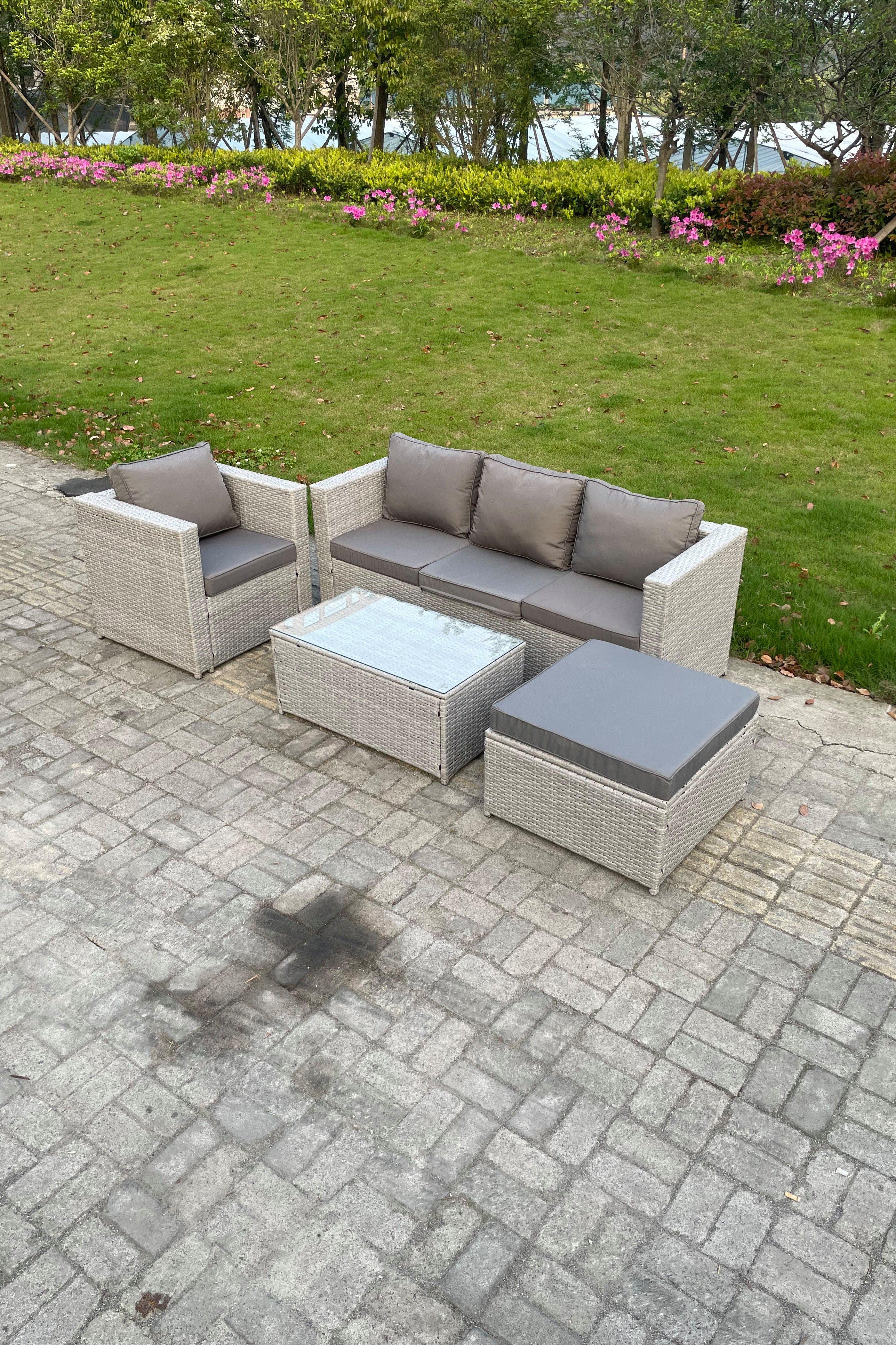 EVRE California Rattan Garden Furniture Set 5 Piece 3 Seater Sofa 1 Ottoman 1 Coffee Table Outdoor Wicker Weave Lounge Sofa and Glass Top Table with Cushions (Grey)