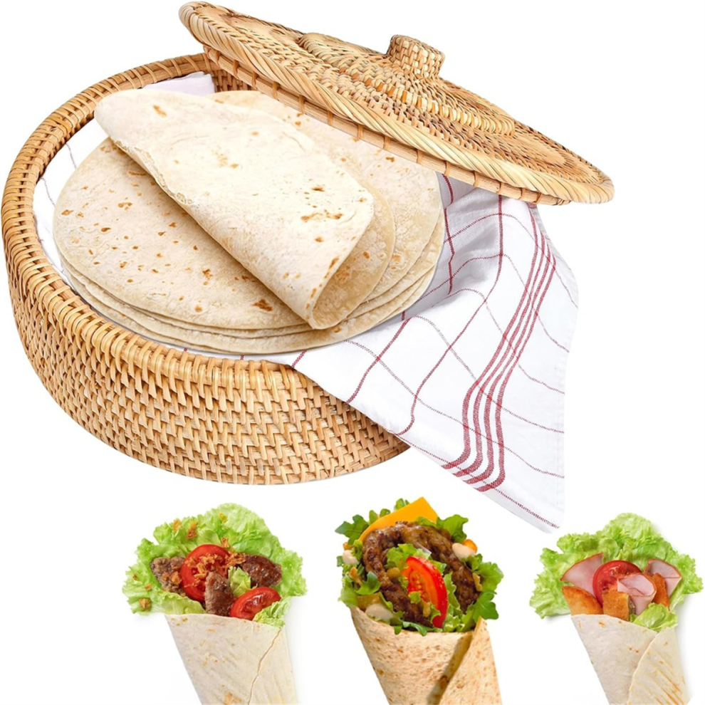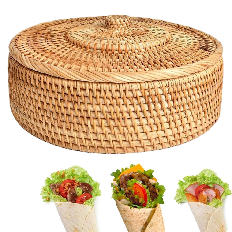 Round Rattan Boxes with Lid Hand-Woven Multi-Purpose Wicker Tray 10.2Inch Picnic Food Bread Table Storage Basket