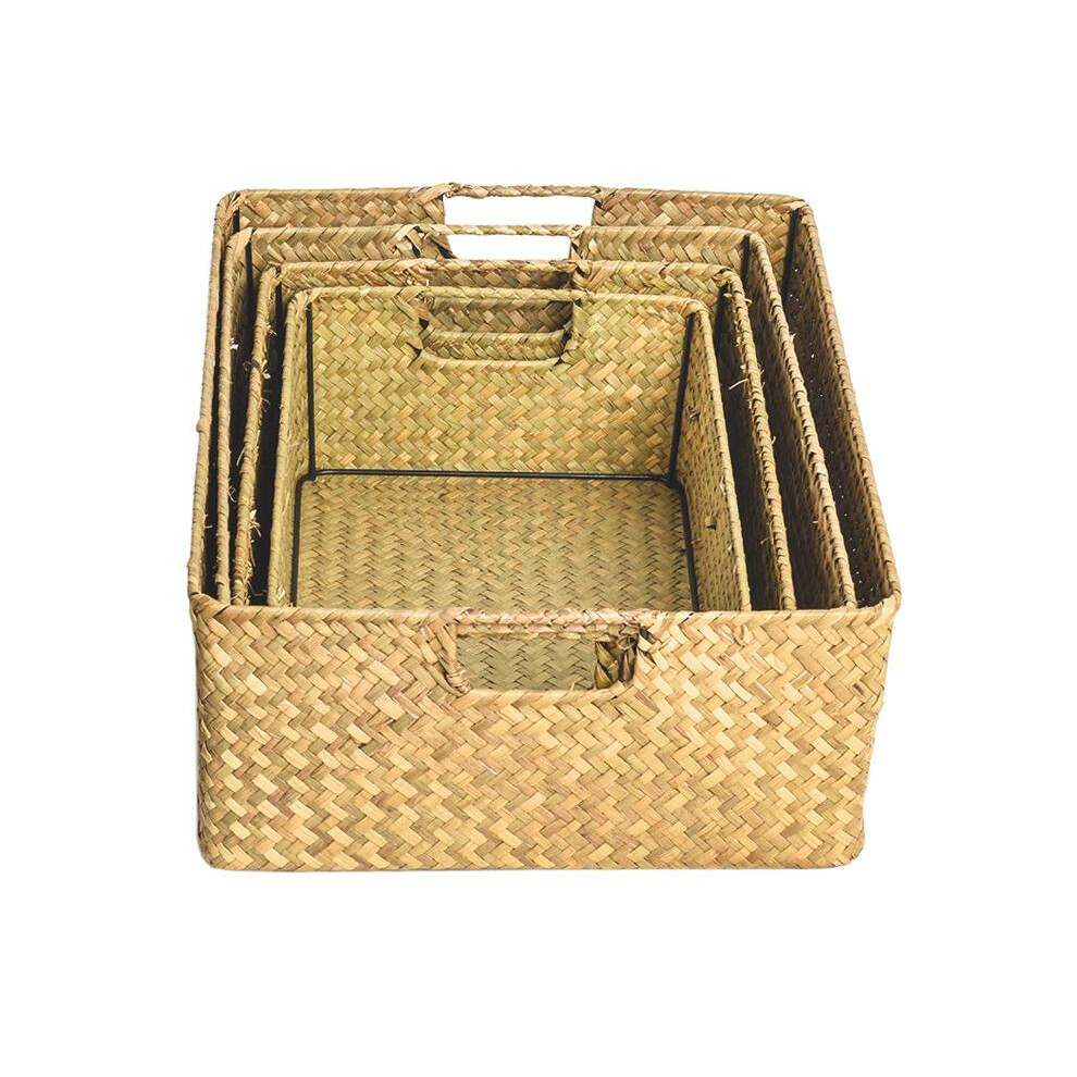 Set of 4 Seagrass Basket with Lid Wicker Storage Basket Decor Storage Boxes Flat