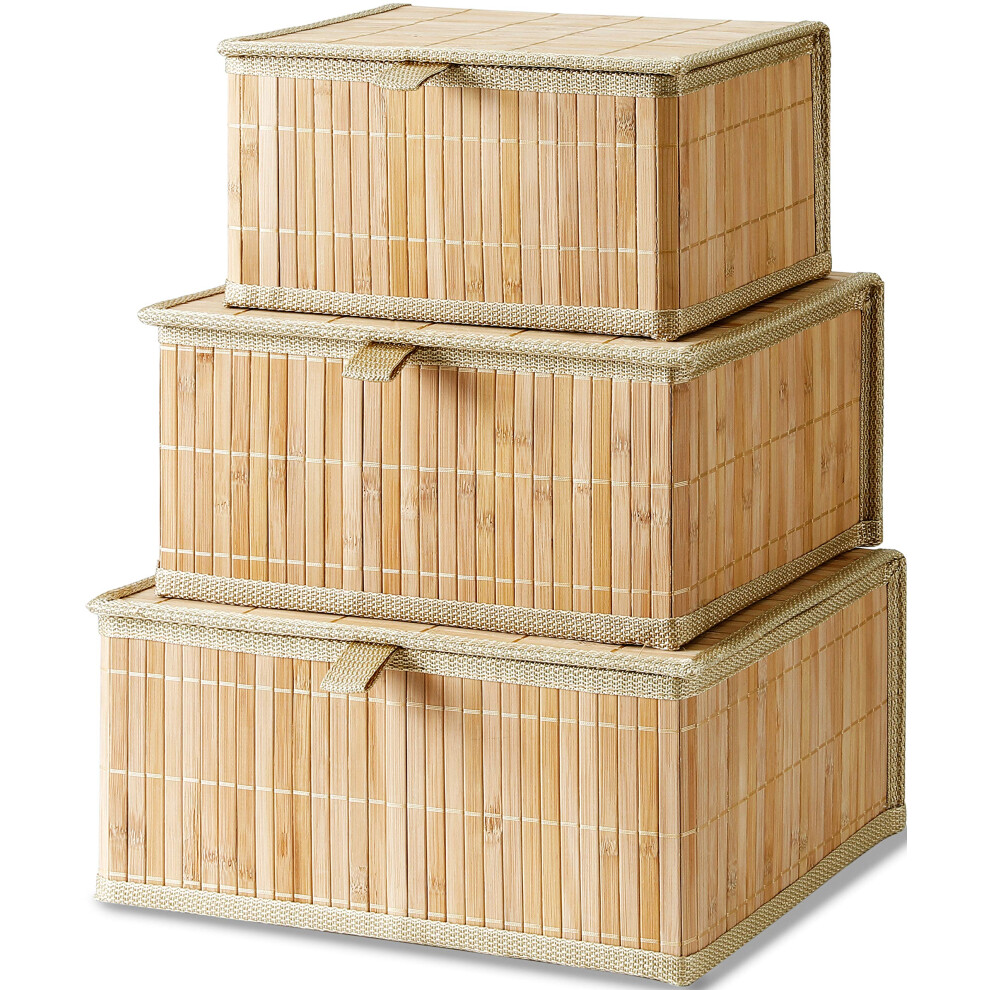 Honygebia Bamboo Decorative Storage Boxes - Set of 3 Woven Lined Storage Basket with Lids Beige Wicker Lidded Baskets for Home Kitchen Shelf Organize