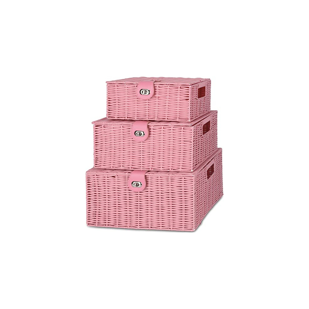 Honygebia Pink Wicker Storage Basket - Woven Baskets with Lid & Lock Set of 3 Decorative Stackable Gift Boxes Organizer for Beauty Makeup Toiletries