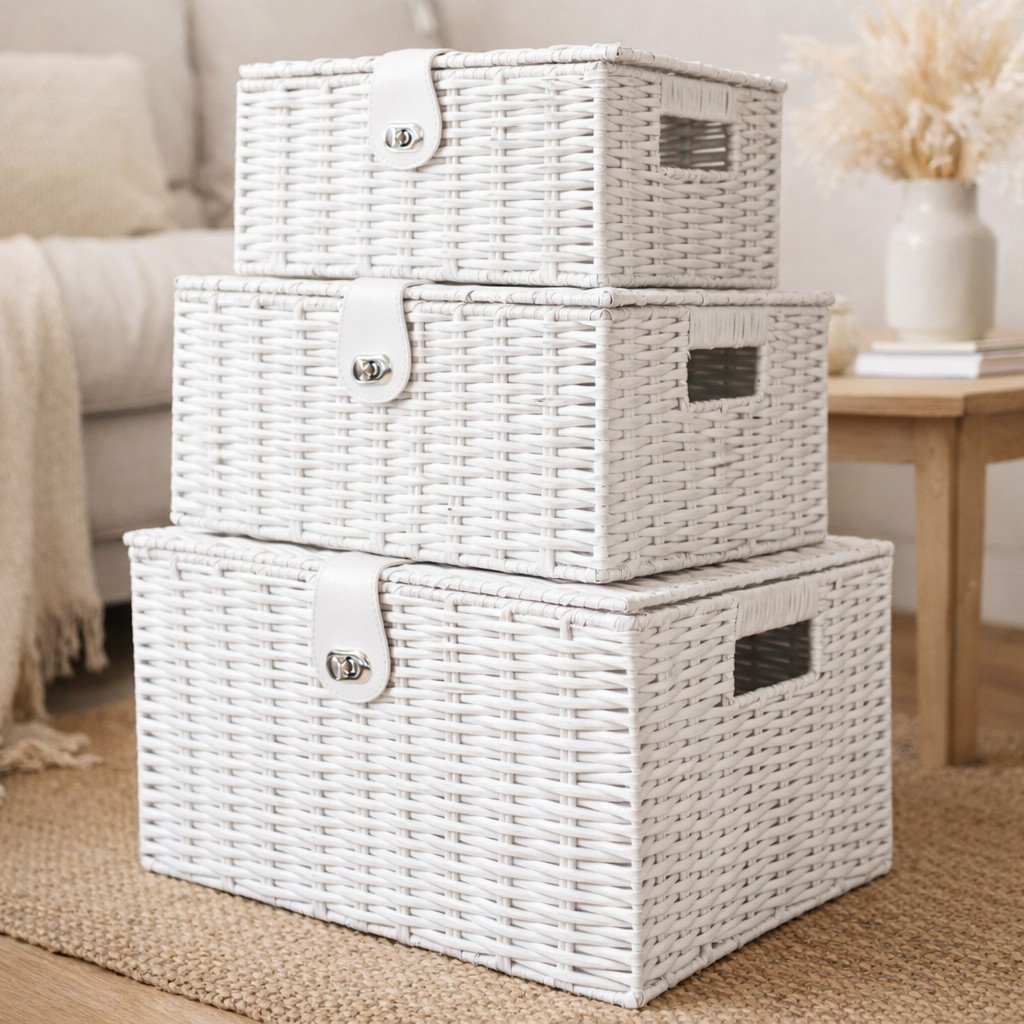 3 Wicker Storage Boxes White Woven Hamper Baskets Lock Stackable Laundry Gifts