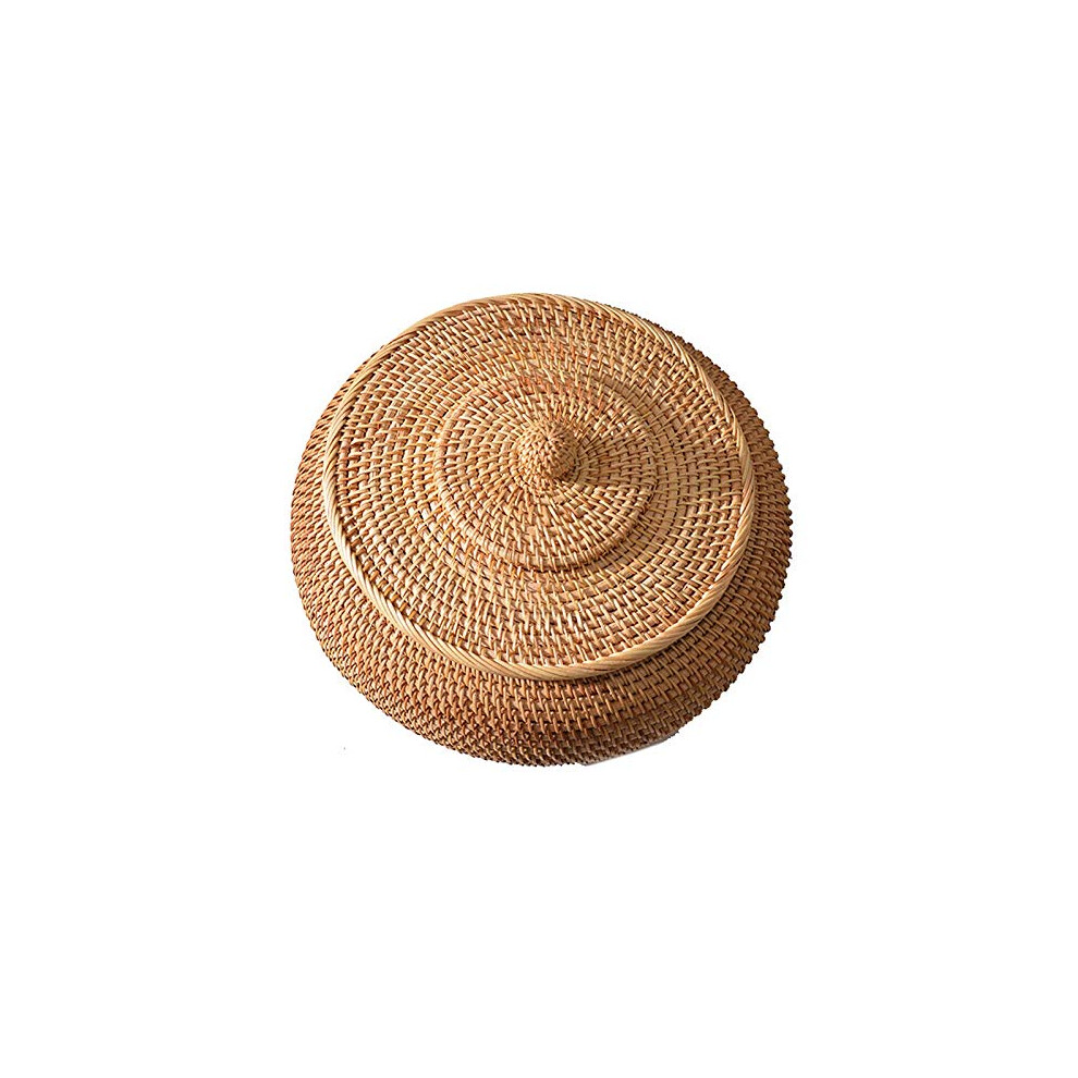 KODENG Round Rattan Boxes with Lid Hand-Woven Multi-Purpose Wicker Tray 8.6Inch Picnic Food Bread Table Storage Basket 22x13cm