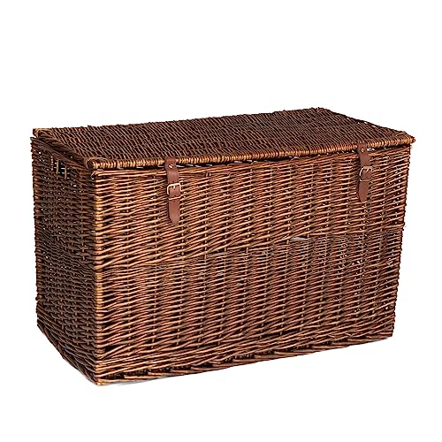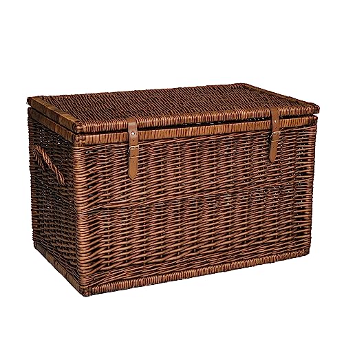 Arthur Cameron - Modena Deluxe Wicker Storage Basket with Lid, Leather Straps to Secure Shut & Strong Wooden Frame - Large wicker basket, storage trunk, storage chest (Large, Distilled Brown)